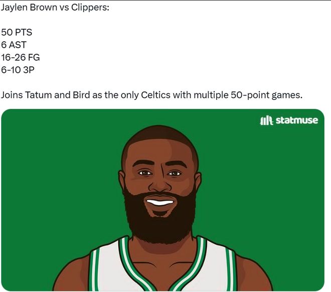 第二,杰伦-布朗成为了凯尔特人队史第三位能够单场多次轰下50分的球员,其他两位分别是塔图姆和伯德。