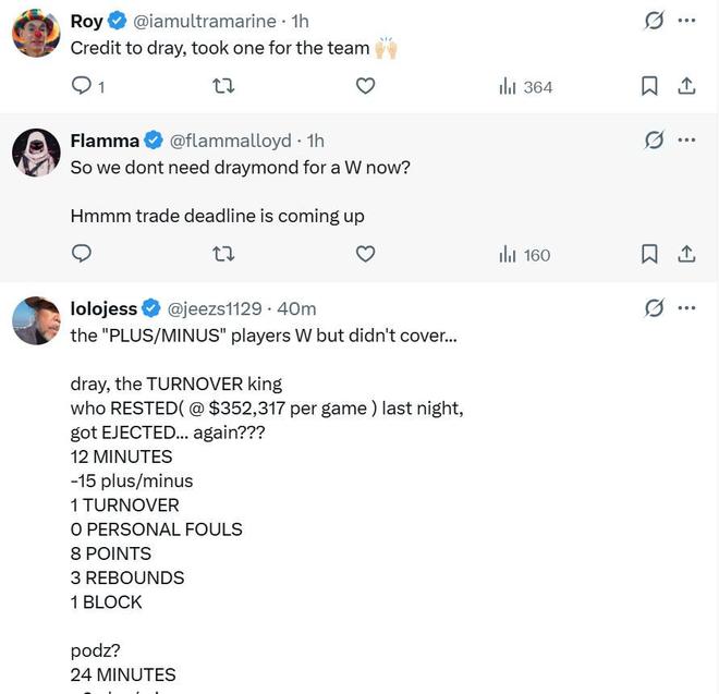 勇士球迷也是一边倒认为勇士是时候送走追梦了,没有他在场时球队明显更好。