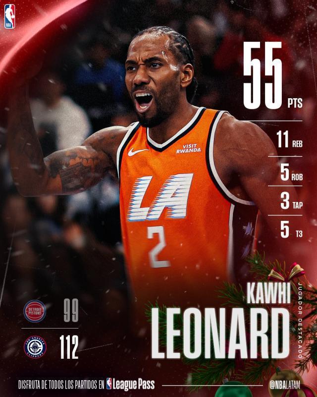那一战的小卡完全是“战神模式”,第二节25分、第三节26分,三节战罢,他就已经拿到了生涯第一个50分。他一度连续命中11次出手,挡拆冲筐、中距离干拔、持球三分...要知道对面是联盟防守效率第二的活塞队,但莱昂纳德却把比赛打成了投篮训练。