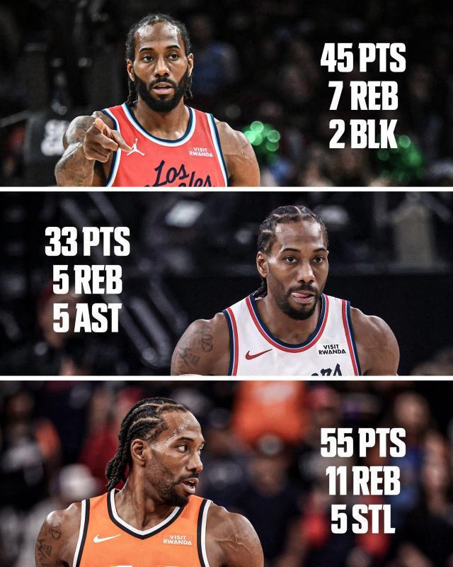 在六连胜期间,用“当代乔丹”来形容莱昂纳德一点也不为过。在本赛季之前,莱昂纳德生涯从未在哪一年常规赛中单场拿到超过2次40+,而仅仅在6连胜期间,他就做到了3次。这位并不以超高得分著称的前锋此前生涯最高分是45分,而在6连胜的后三场比赛里,他就两次达到这一分数,对阵活塞一战更是狂砍55分,创造个人得分纪录的同时,也追平了哈登在本赛季早些时候创造的快艇队史单场得分纪录。