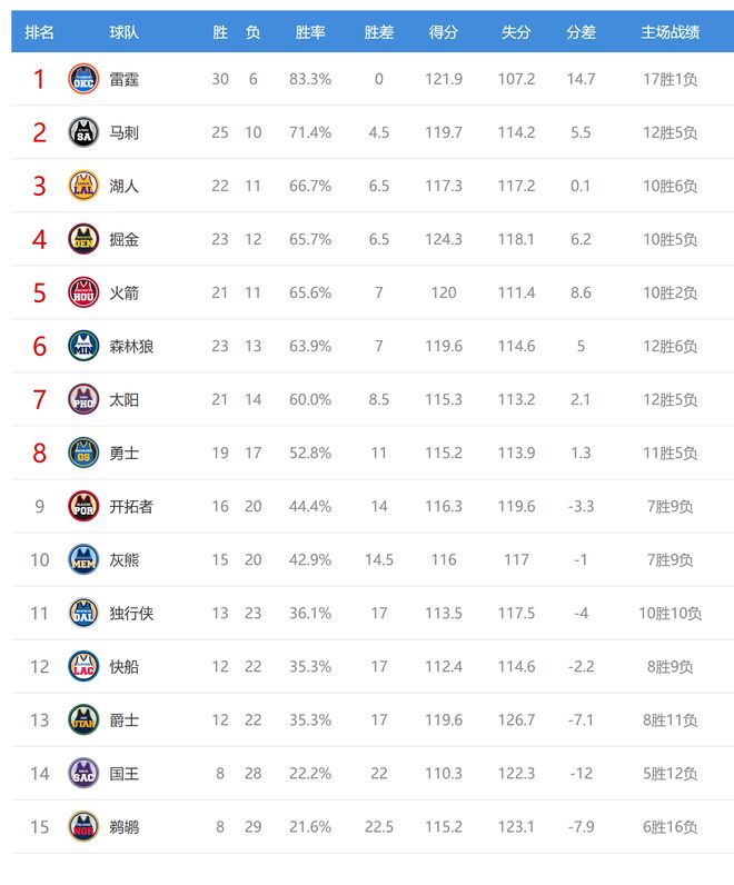太阳赢球后21胜14负,继续排名西部第七,领先第八的勇士2.5个胜场,雷霆输球后4连胜终结,战绩30胜6负继续稳居联盟第一。