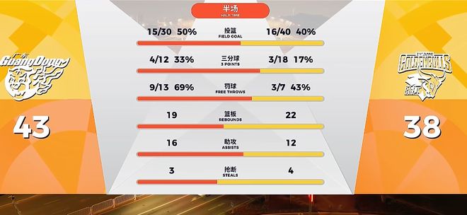 半场结束,凭借萨姆纳制造的2+1,以及胡明轩的2罚不进,约克外线2连铁,广东43-38仅领先浙江5分。萨姆纳半场15分5助3犯,徐杰11分。