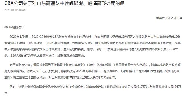为严肃联赛纪律,根据《中国男子篮球职业联赛纪律准则》第四章第四十九条之规定,对山东高速队主教练邱彪处以停赛2场、罚款5万元的处罚,停赛场次为2026年1月6日第十一轮场序105、1月9日第十二轮场序119的比赛。根据《纪律准则》第二章第二十四条之规定,对山东高速队翻译薛飞处以罚款2万元的处罚。