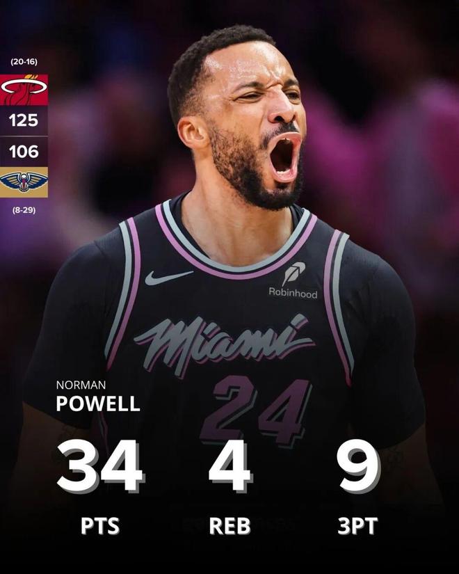 拿上一场比赛来说,热火主场125-106大胜鹈鹕,鲍威尔全场只打了不到29分钟,投篮15中11,三分12中9,罚球4中3,得到34分3篮板3助攻2抢断。