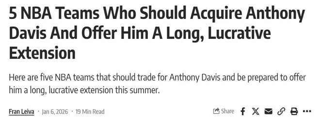 继名记Shams此前曝出独行侠计划交易浓眉哥,围绕弗拉格重新建队后,TA名记Sam Amick又在最新报道中指出,联盟内部数支球队消息人士透露,独行侠正在四处疯狂兜售浓眉哥。
