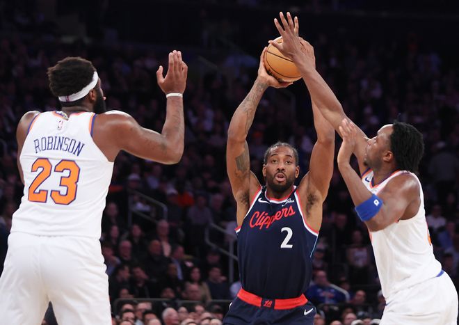 好景不长啊,下半场开始尼克斯对莱昂纳德的防守策略变了,他们放弃去夹击持球人哈登,开始在小卡运球进入三分线内后的双人包夹,莱昂纳德两个回合都未能获得出手的机会,第三节打了7分钟只拿到4分1助攻1抢断,快船也被尼克斯反超。