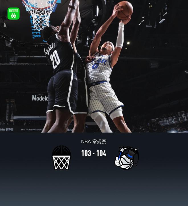 加时赛篮网埃戈尔-德明拿下10分,魔术温德尔-卡特拿下2分,最终篮网103-104不敌魔术
