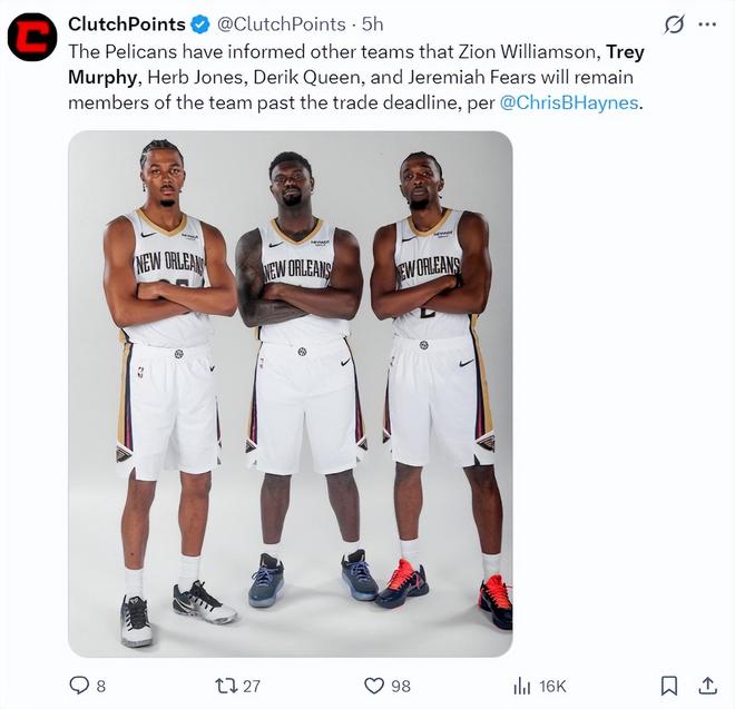 赛前传来了一个消息,根据《雅虎体育》记者克里斯-海恩斯的消息,鹈鹕队已经告知联盟各队,在交易截止日前:锡安、墨菲、奎因、费尔斯、赫伯特-琼斯五人都会留在鹈鹕阵容中,这5人之外的球员才能被交易。