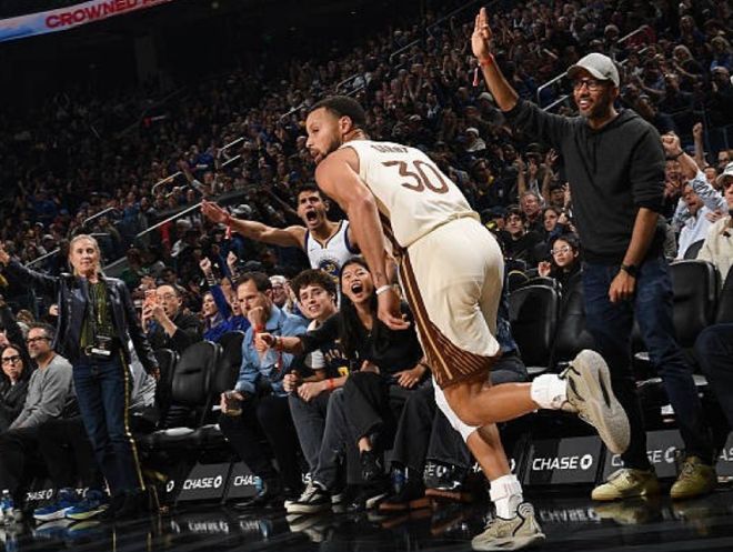 易边再战,库里硬拔三分命中,摔得四脚朝天依旧没有吹罚犯规, 回头同一位置还能进,外线连中两记三分,个人目前已经得到27分。国王连续失误,勇士第三节末段打出一波13-0,三节结束领先国王13分。