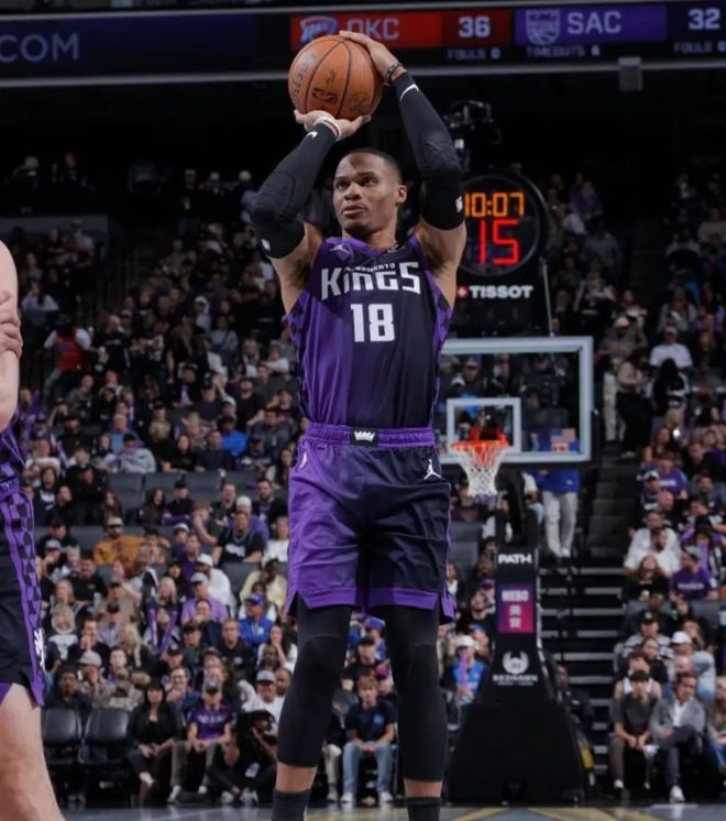 国王队这边,威少11中6得到13分4篮板7助攻3失误;德罗赞空砍2分2篮板3助攻。