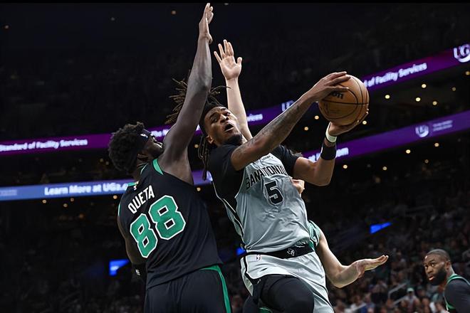 本场比赛中,虽然马刺取得了比赛的胜利,但是球队的先发后场新星斯蒂芬-卡斯尔(Stephon Castle)的表现算得上是令人大跌眼镜。卡斯尔全场出场26分36秒,投篮16中3,三分线外7中1,罚球5中2,得到了9分2篮板5助攻2抢断的数据,还有2次失误,正负值也是低到了全队最低的-7。卡斯尔在进攻端其实得到了大量的出场时间和出手机会,然而他的进攻效率一塌糊涂,外线投篮手感糟糕透顶,而且他在进攻选择方面也是存在着明显的问题的,显得有些上头了,浪费了大量的机会。卡斯尔在防守端的表现还算中规中矩,但是这也没有办法改变他在进攻端给球队造成的巨大负面影响。最后时刻卡斯尔没有出现在球场上,这反而是马刺能够稳住局面并且拿下胜利的关键因素。