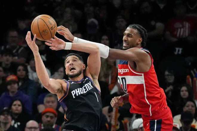 次节比赛,太阳连续两节单节得分30+压制奇才,奇才被限制首次单节不足25分。太阳前2分半钟40-35领先,太阳连得5分扩大10分优势,约翰逊中投追分,太阳多点开花一波10-2攻势,已经扩大55-39领先。奇才连追5分,太阳继续扩大领先优势,太阳单节33-22净胜11分,上半场结束太阳扩大65-50领先奇才。前两节比赛,奇才三分13中3,萨尔13+9;太阳三分27中10,布克13分7助攻与奥尼尔11+6。