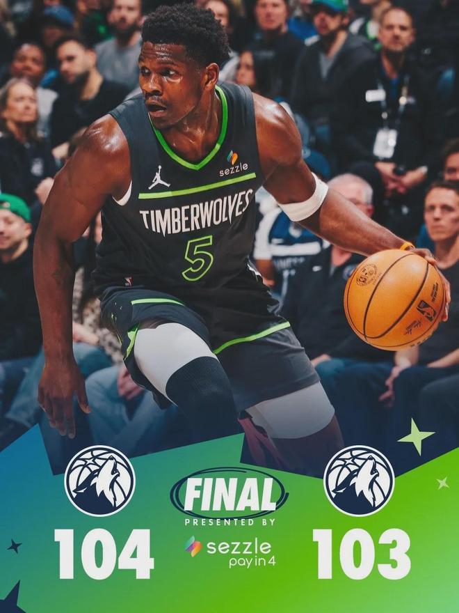 马刺拼到前场板,福克斯三分也没能命中,马刺连续错失绝杀。全场结束,森林狼104-103险胜马刺,完成19分大逆转!兰德尔防守文班的效果,明显比戈贝尔好。爱德华兹23分2板3助、文班亚马29分7板3断!状元大战结束了。