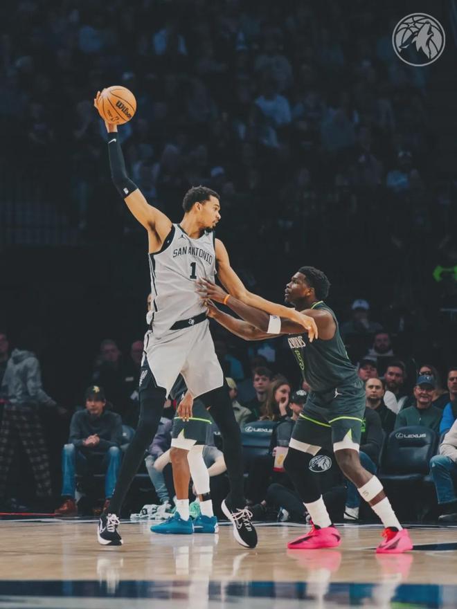 文班不敢发力,兰德尔主动贴防文班,造成后者出界失误。兰德尔丝毫不怵文班,利用突破造成文班第5犯,比赛最后4分钟,森林狼追到2分。戈贝尔重新登场,直接对文班无球犯规,马刺1罚1掷。森林狼换下戈贝尔,启用小个阵容。