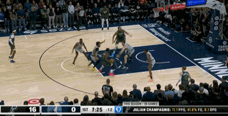 (森林狼主场有不进第一颗球不坐下的传统)