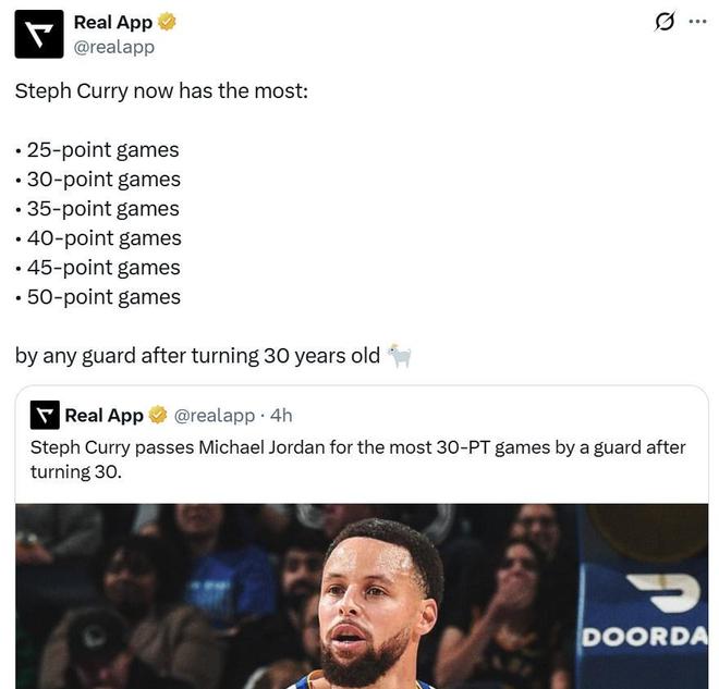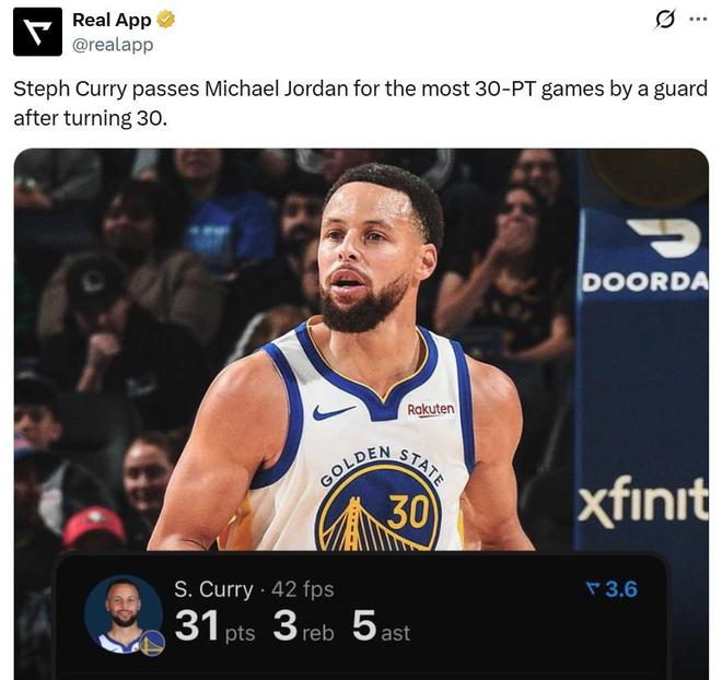 凭借这样的表现,库里30岁后第176场砍下30+得分表现,成功超越“篮球之神”乔丹升至NBA历史后卫第一。