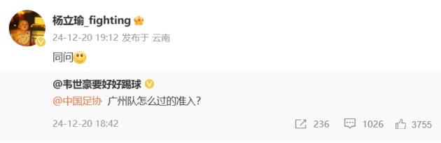 12月20日讯 韦世豪发声质疑后,杨立瑜转发韦世豪微博质疑足协准入。