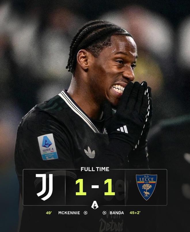 随后,尤文一度完全压制对手,并获得了点球机会。但是乔纳森-戴维却把球给罚丢,痛失反超良机。接下来,尤文的进攻开始变得急躁,莱切则全线回收死守,最终将1-1的比分保持到终场,爆了不小的冷门。