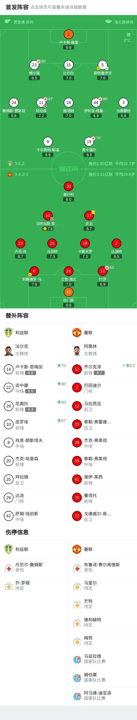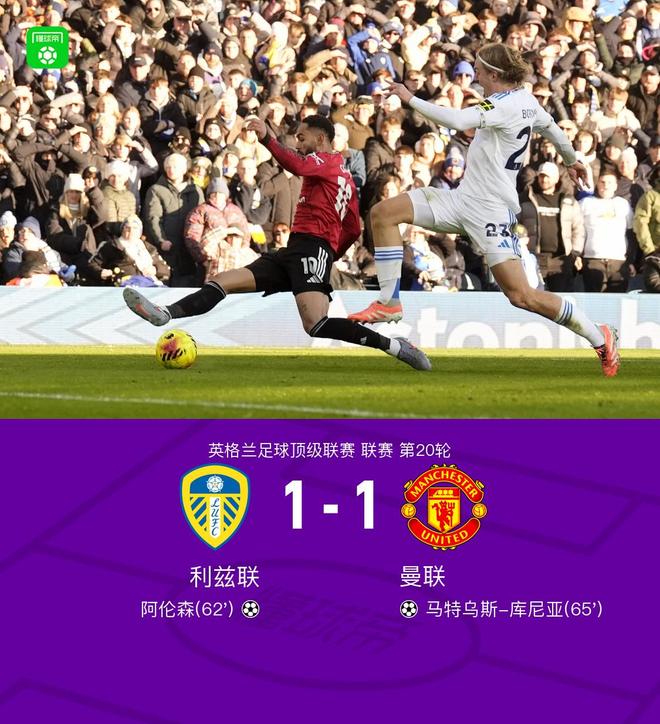 北京时间1月4日,英格兰足球超级联赛第20轮展开角逐,利兹联坐镇主场迎战曼联。上半场库尼亚精彩破门,但此前队友越位,进球无效。下半场海文防守不利,阿伦森小角度破门,之后齐尔克泽直塞妙传,库尼亚推远角得手。最终曼联客场1-1战平利兹联。