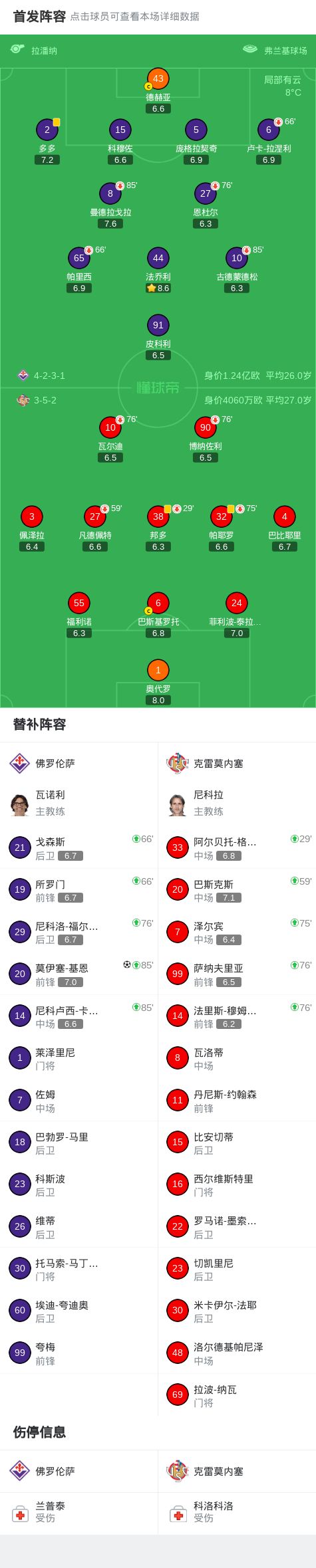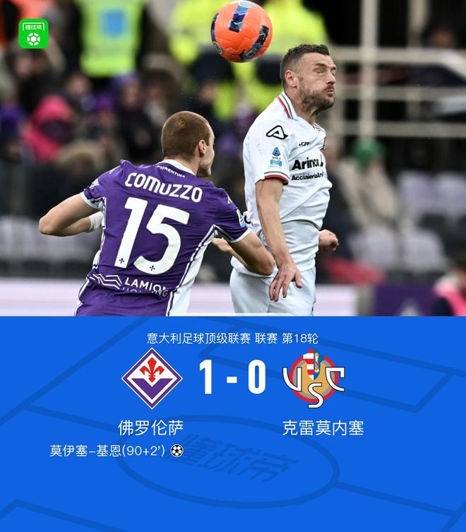 北京时间1月4日22:00,意甲联赛第18轮,佛罗伦萨坐镇主场迎战克雷莫内塞。上半场,皮科利造点被取消;下半场补时阶段,莫伊塞-基恩替补登场攻入全场唯一进球,帮助球队完成绝杀。最终,佛罗伦萨以1-0战胜克雷莫内塞,暂升到第18名,落后安全区2分。