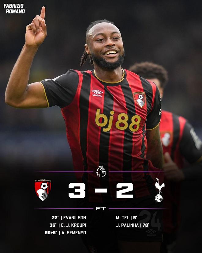 本赛季英超第21轮,伯恩茅斯3-2战胜热刺,就此结束了英超11轮未胜的局面。