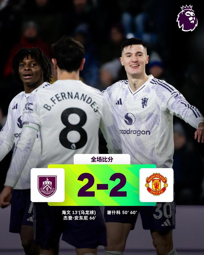 北京时间1月8日凌晨,英超第21轮焦点战,曼联作客摩亚球场挑战伯恩利。上半场,汉弗莱斯传中打在海文脚上变线入网。下半场,谢什科先后接B费和多古的助攻破门上演梅开二度,杰登-安东尼兜射救主。最终,曼联客场2-2战平伯恩利,遭遇三连平。