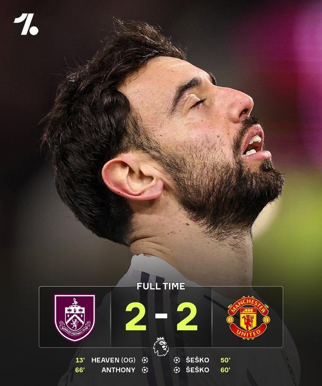 全场战罢,曼联客场2-2战平倒数第2的伯恩利,只能从副班长身上拿到1分。