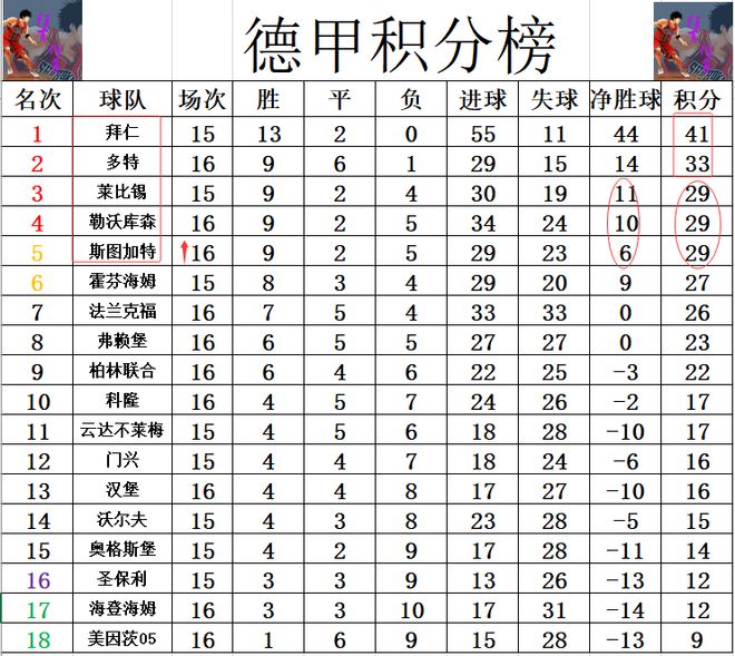 积分榜方面,拜仁13胜2平继续保持不败,少赛1场领先多特8分高居榜首。勒沃库森惨败后,净胜球少了莱比锡1个“自动”跌出前3,莱比锡躺进前3,斯图加特大胜后追了上来,净胜球劣势排在第5。