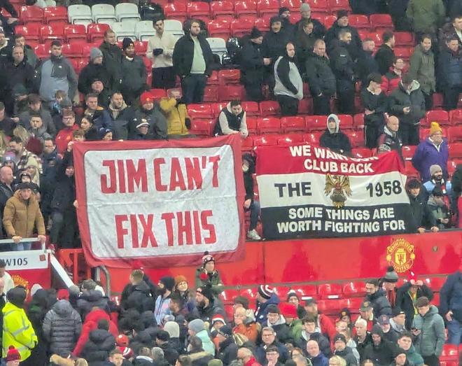 雨夜中,现场曼联球迷打出了“吉姆(拉特克利夫)解决不了这个问题”的横幅,以及“我们想我们的俱乐部回来”,表达了对管理层的不满和无限失望之情。